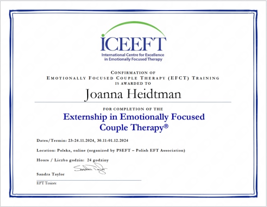 Spotkania są dla mnie bardzo otwierające jednocześnie wspierające. Jestem zaskoczona, że po 7 latach innej terapii nie udało mi się uzyskać tego co u Pani Joanny po kilku miesiącach. Miałam różne odczucia na początku ale to chyba była taka obrona przed tym nad czym chciałam pracować. Osobiście polecam. Uważam że naprawdę warto.
