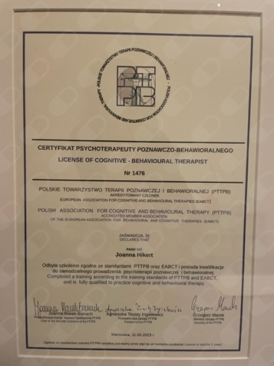 * Jestem certyfikowanym psychoterapeutą poznawczo-behawioralnym Polskiego Towarzystwa Terapii Poznawczo-Behawioralnej (PTTPB), zrzeszonego w European Association for Behavioural and Cognitive Therapies (EABCT) (nr certyfikatu: 1476).