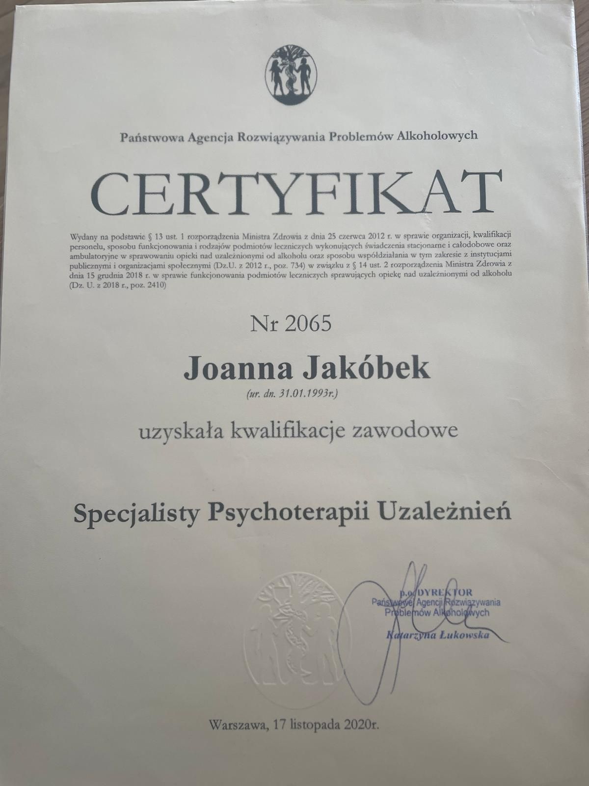 Jestem psychoterapeutą psychodynamicznym i certyfikowanym specjalistą uzależnień (PARPA nr 2065).
