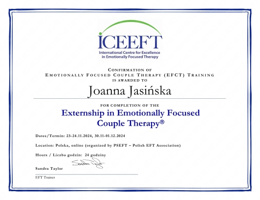 Szczególnie lubię pracować z parami doświadczającymi trudności w pielęgnowaniu łączącej ich więzi. Na spotkaniach pomagam odtwarzać bliskość, zaufanie i wzajemną empatię. W terapii par stosuję podejście EFT, skupione na tworzeniu bliskości, bezpieczeństwa i zrozumienia pomiędzy parterami/małżonkami.