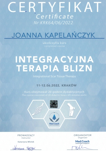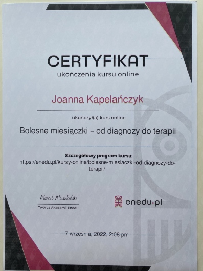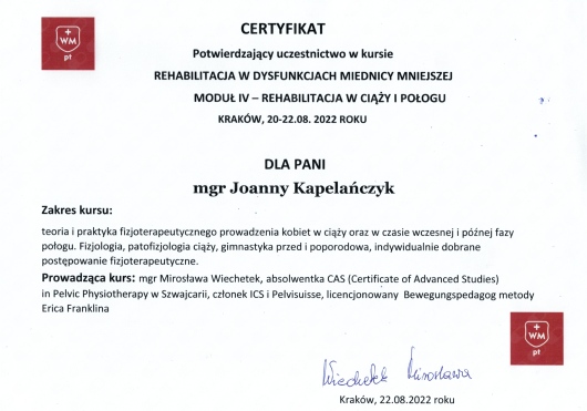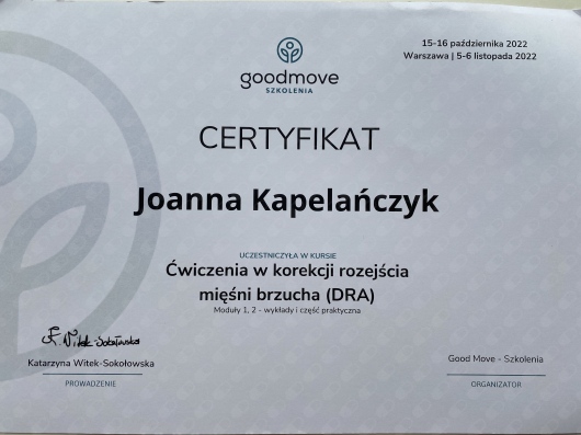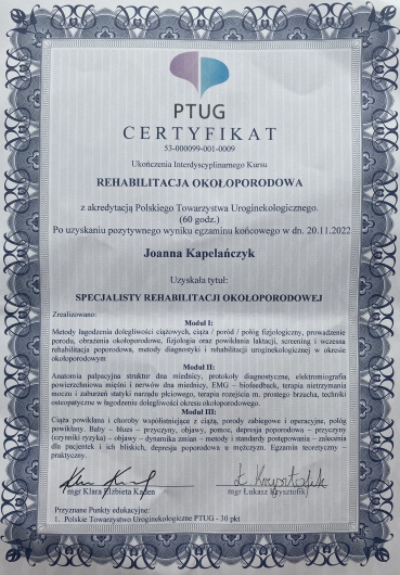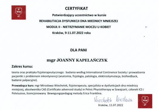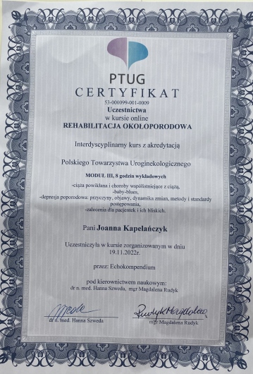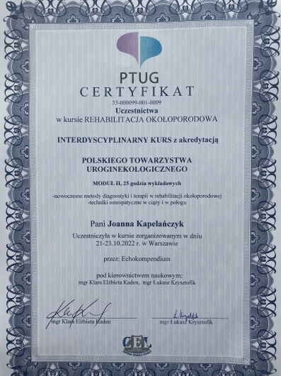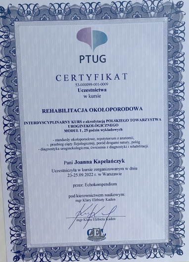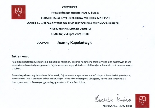 Aby jeszcze lepiej pomagać swoim pacjentkom nieustannie szkolę się na wielu szkoleniach z tematyki uroginekologicznej, fizjoterapeutycznej oraz ruchowej.
