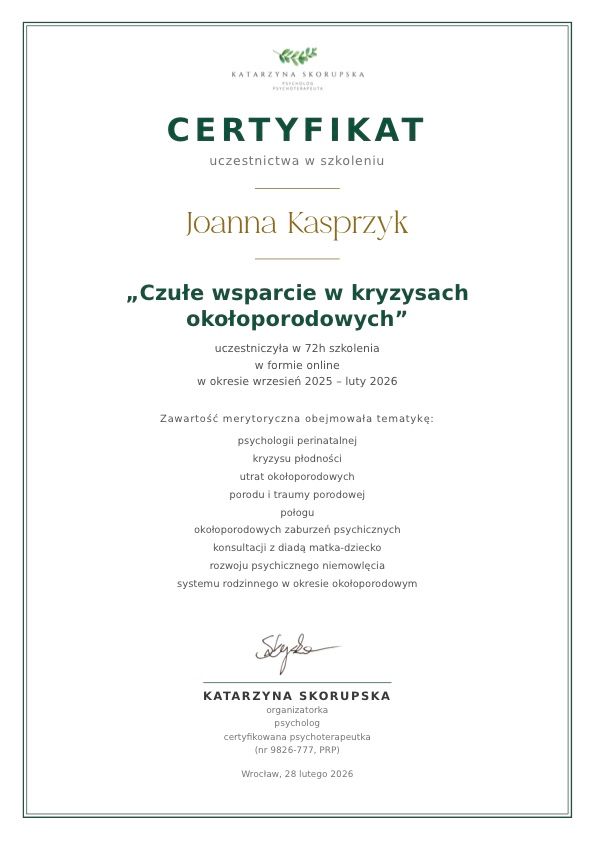 Ukończyłam szkolenie „Czułe wsparcie w kryzysach okołoporodowych”, pogłębiające moją wiedzę z zakresu psychologii perinatalnej. Obejmowało ono m.in. tematykę kryzysu płodności, strat okołoporodowych, doświadczenia porodu, połogu, trudności emocjonalnych w tym okresie, relacji matka–dziecko oraz zmian w systemie rodzinnym.