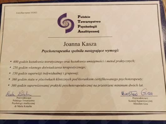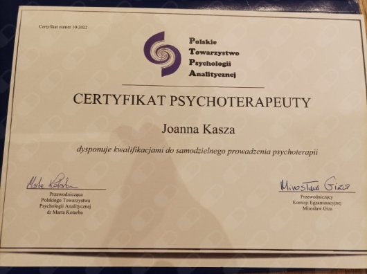Ukończyłam Czteroletnie (całościowe) szkolenie Psychologii Analitycznej i Psychoterapii Jungowskiej (2015-2019) organizowane przez Polskie Towarzystwo Psychologii Analitycznej, akredytowany przez Polskie Towarzystwo Psychologii Klinicznej (zgodnie z wymogami NFZ), oraz poprzedzający go Dwuletni Kurs Psychologii Analitycznej (2011-2013). Ukończyłam również 7 letnią indywidualną ścieżkę szkoleniową (routerską) w zakresie psychoanalizy jungowskiej akredytowaną przez