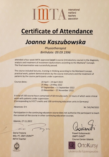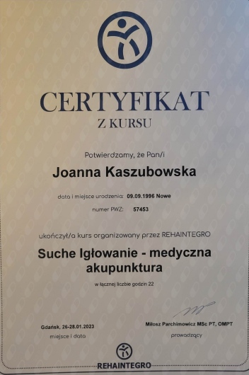 Dzień dobry, nazywam się Joanna Kaszubowska i jestem absolwentką Gdańskiego Uniwersytetu Medycznego na kierunku fizjoterapia. W swojej pracy wykorzystuję wiedzę i techniki zdobyte na kwalifikowanych kursach. Do tej pory ukończyłam kurs Koncepcji Terapii Manualnej według Maitlanda, Suche Igłowanie - medyczna akupunktura, Masaż Tkanek Głębokich z rozluźnianiem mięśniowo-powięziowym, Taping Rehabilitacyjny. Podczas terapii skupiam się na dokładnej konsultacji aby jak najlepiej zdiagnozować problem pacjenta oraz na dobrej relacji z terapeutą, która jest podstawą do dobrej i efektywnej współpracy.
