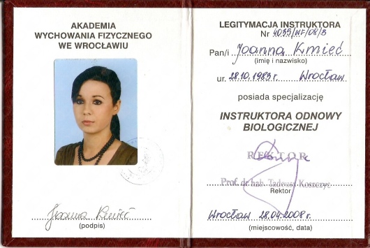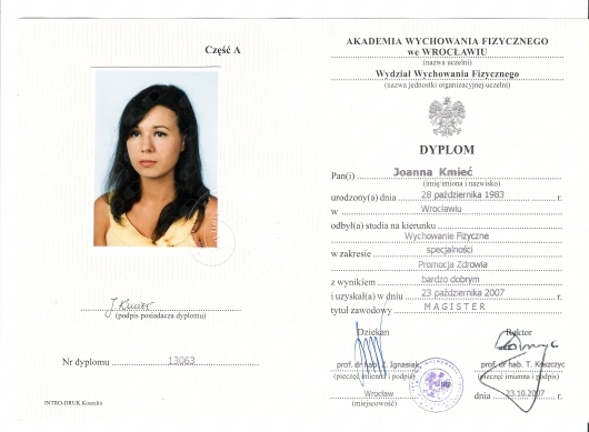 Doktor nauk medycznych i nauk o zdrowiu w dyscyplinie Wychowania Fizycznego. Absolwentka wydziału Wychowanie fizyczne i Fizjoterapia na AWF Wrocław, instruktorka fitness.