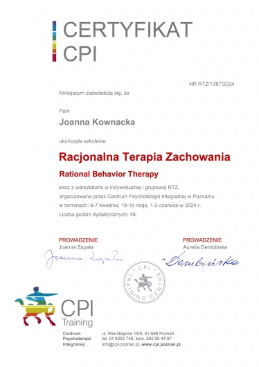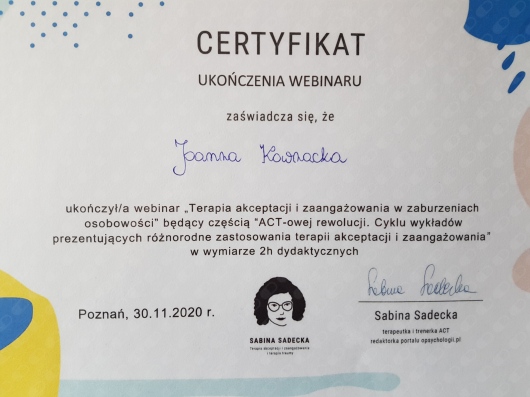 Jestem bardzo zadowolona ze spotkań z Panią Joanna. Dzięki niej udało mi się wyjść z życiowego dołka. Pomimo mojego początkowego sceptycznego nastawienia , Pani mi pokazała że są psycholodzy, którzy dbają o swoich pacjentów. Jestem bardzo wdzięczna bo czuję że dzięki Pani moje życie zmierza w lepsza stronę.