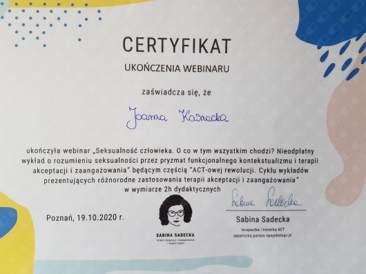 Pani Joanna jest przecudowną osobą, która pomoże nawet najbardziej sceptycznie nastawionej osobie jaką byłam ja. Nie rozumiałam w jaki sposób terapia miała mi pomóc, jednak zdecydowałam się zapisać i wybrałam Panią Joannę. To był strzał w 10. Dzięki terapii nauczyłam się rozumieć siebie, swoje zachowania i myśli i pracuję nad tym, aby było tylko lepiej. Dało mi to wiele dobrego. Na wizycie nie czułam się oceniania, czego się obawiałam, zamiast tego czułam się zaopiekowana. Jeszcze raz dziękuję za te miesiące bardzo miłej współpracy :)