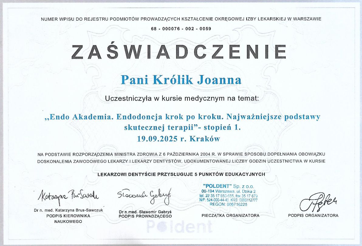 Jestem absolwentką kierunku lekarsko-dentystycznego na Uniwersytecie Jagiellońskim w Krakowie. Miałam okazję zdobywać doświadczenie pod okiem specjalistów w 5 Wojskowym Szpitalu Klinicznym z Polikliniką SPZOZ w Krakowie. W pracy szczególnie interesuję się nowoczesnymi metodami leczenia zachowawczego i estetycznego. Stale poszerzam swoją wiedzę, uczestnicząc w kursach i konferencjach, aby oferować pacjentom leczenie zgodne z najnowszymi standardami. Zawsze staram się stworzyć przyjazną atmosferę i indywidualnie podejść do każdego pacjenta. Zależy mi, by wizyty były komfortowe i skuteczne.