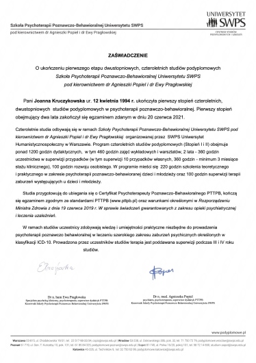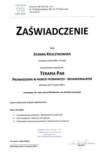 Jestem absolwentką Psychologii Uniwersytetu Łódzkiego oraz ukończyłam czteroletnią Szkolę Psychoterapii Poznawczo-Behawioralnej na Uniwersytecie SWPS w Warszawie. Zdobyłam certyfikat psychoterapeuty poznawczo-behawioralnego, akredytowany przez Polskie Towarzystwo Terapii Poznawczo Behawioralnej. Doświadczenie w zawodzie psychologa zdobywałam m.in. w Szpitalu im. Babińskiego w Łodzi na oddziale psychiatrii osób dorosłych i ogólnopsychiatrycznym oddziale żeńskim. Przez dwa lata pracowałam w Centrum Zdrowia Psychicznego Centralnego Szpitala Klinicznego UM w Łodzi, oraz w gabinetach prywatnych. Od 4 lat prowadzę swój indywidualny gabinet psychoterapii. Posiadam bogate doświadczenie w pracy terapeutycznej z osobami z diagnozą psychiatryczną oraz z osobami poszukującymi pomocy w radzeniu sobie z trudnościami życiowymi. Oferuję wsparcie specjalistyczne w formie psychoterapii (online) oraz szeroko rozumianego poradnictwa psychologicznego przede wszystkim w zakresie kryzysów osobistych, zaburzeń nastroju i lękowych, zaburzeń adaptacyjnych, ADHD, zaburzeń odżywiania, poczucia niskiej wartości, rozwoju osobistego. Pracuje z osobami dorosłymi. Swoją praktykę opieram głównie na założeniach i metodach podejścia poznawczo-behawioralnego z elementami terapii schematów. Swoją prace poddaje regularnej superwizji.