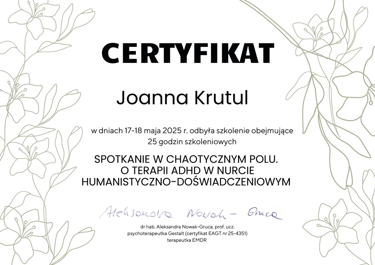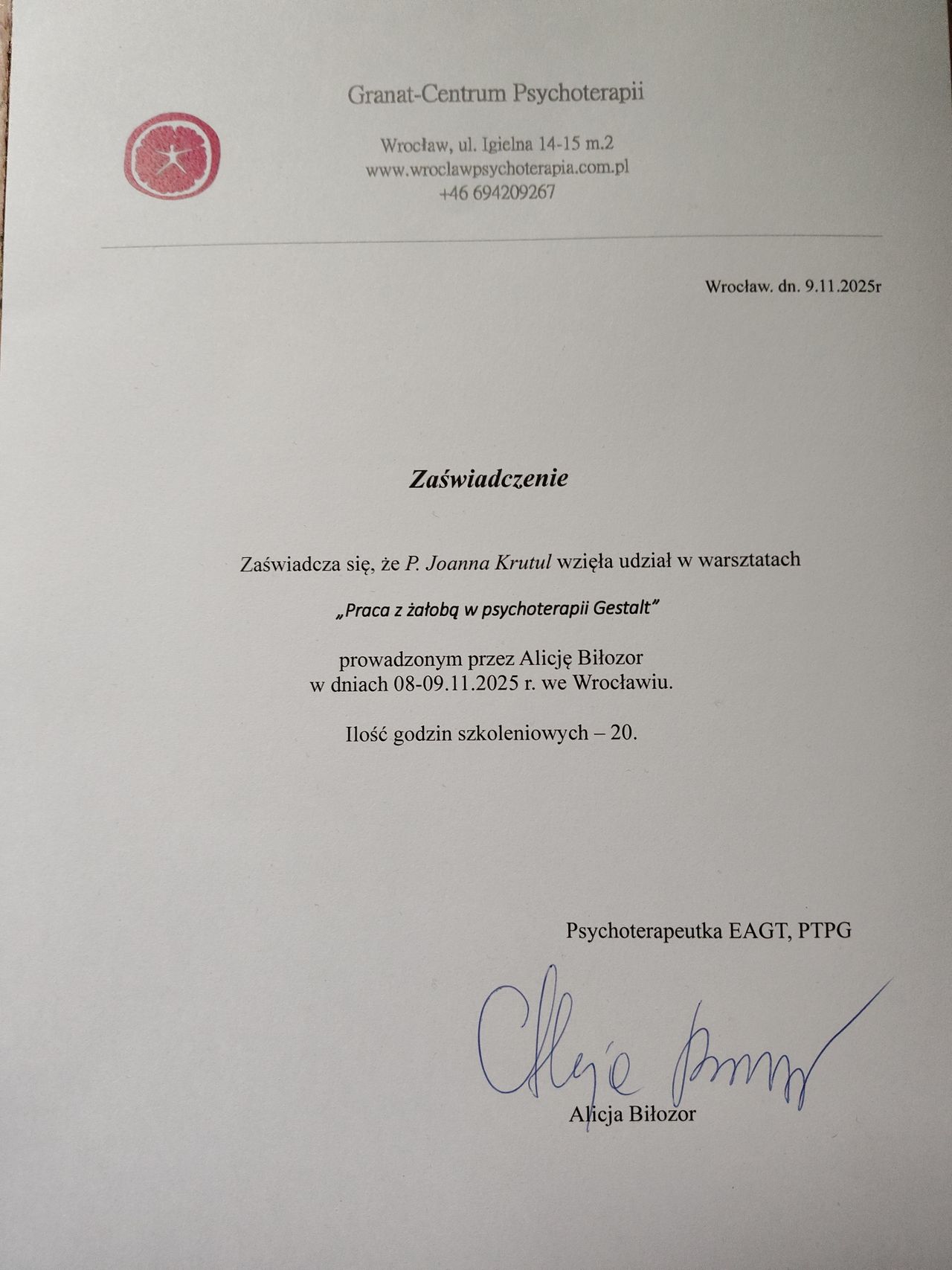 Z całego serca polecam Panią Joannę Krutul jako psychoterapeutę i psychologa. Jej profesjonalizm, empatia i zaangażowanie w pracę są niezwykle imponujące. Pani Joanna potrafi stworzyć bezpieczną i wspierającą atmosferę, w której można otwarcie mówić o swoich problemach. Dzięki jej wsparciu zyskałam nowe perspektywy i narzędzia, które pomagają mi lepiej radzić sobie z wyzwaniami codziennego życia. Każda sesja była dla mnie krokiem naprzód w kierunku lepszego zrozumienia siebie i poprawy jakości mojego życia. Dziękuję za wszystko!