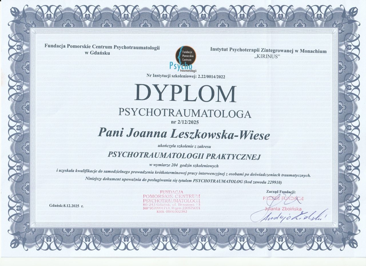 Jestem absolwentką Uniwersytetu Gdańskiego na kierunku psychologia oraz studiów podyplomowych z zakresu psychologii klinicznej na Gdańskim Uniwersytecie Medycznym jak i seksuologii na Uniwersytecie A. Mickiewicza w Poznaniu. Obecnie kończę specjalizację z psychologii klinicznej. Jestem członkiem Polskiego Towarzystwa Psychiatrycznego. Ukończyłam Studium Socjoterapii i Treningu Interpersonalnego przy Krakowskim Centrum Psychodynamicznym oraz 4 - letnie całościowe szkolenie z zakresu psychoterapii w Instytucie Neurologii i Psychiatrii w Warszawie atestowane przez PTP, obecnie w trakcie certyfikacji. Ukończyłam szkolenie z zakresu psychotraumatologii w Fundacji Pomorskie Centrum Psychotraumatologii oraz szkolenie z zakresu terapii par i małżeństw w Krakowskiej Fundacji Rozwoju Psychoterapii oraz wiele innych specjalistycznych szkoleń z zakresu diagnozy oraz terapii.