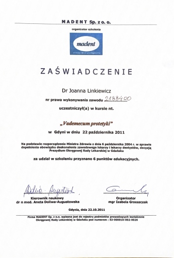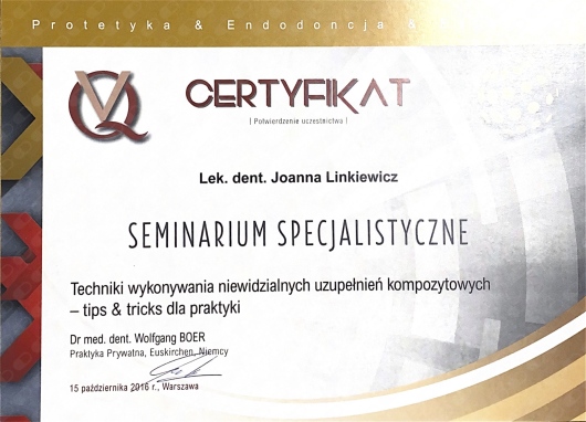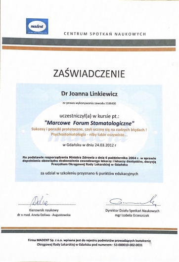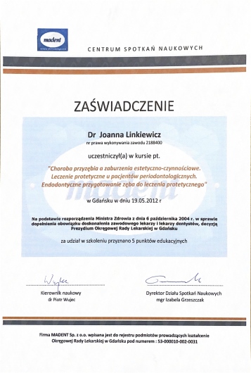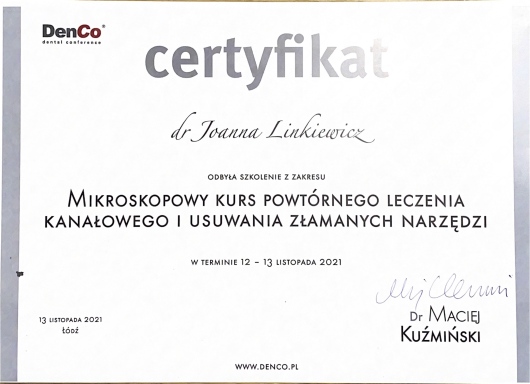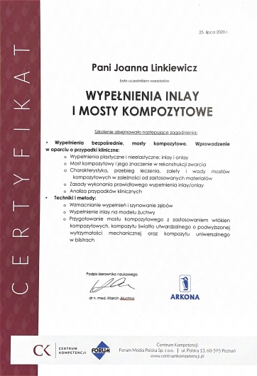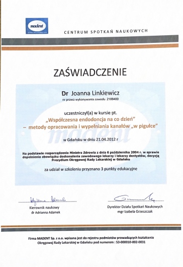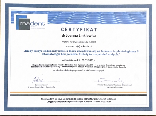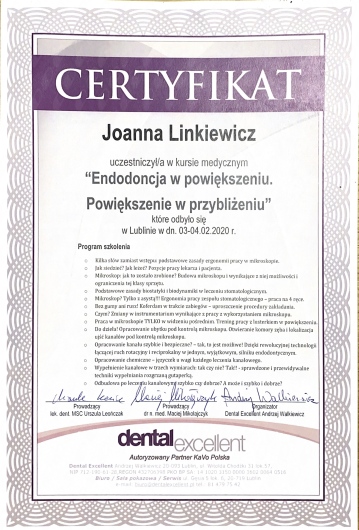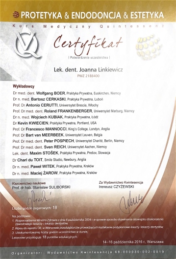 Jaki jest zakres porad oferowanych przez Joanna Linkiewicz?Joanna Linkiewicz to stomatolog. Na podstawie swojego doświadczenia i wykształcenia Joanna Linkiewicz oferuje usługi takie jak: konsultacja protetyczna, Konsultacja stomatologiczna, doraźna pomoc stomatologiczna, pacjent z bólem, konsultacja endodontyczna, leczenie próchnicy, pakiet higienizacyjny, Leczenie próchnicy u dzieci, wizyta adaptacyjna (bez leczenia), usunięcie zęba mlecznego, Endodoncja mikroskopowa.