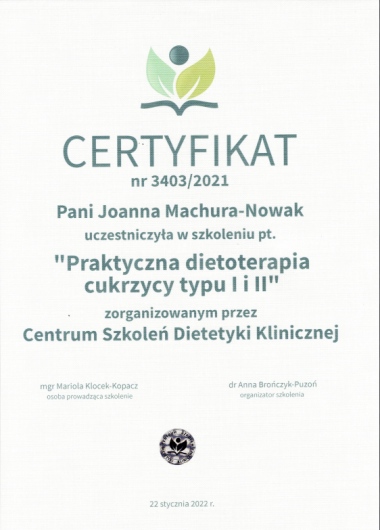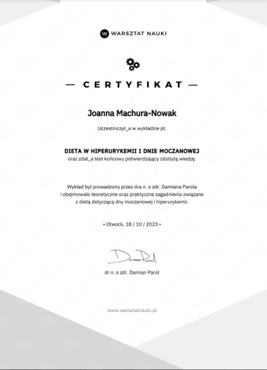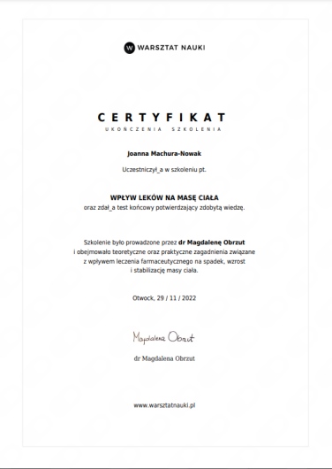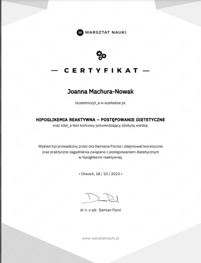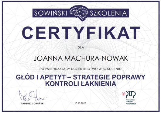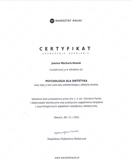 Praca z pacjentami pozwala mi na ciągły rozwój oraz doskonalenie umiejętności interpersonalnych. Od października zaczynam studia podyplomowe z psychodietetyki, aby móc jeszcze lepiej pomagać pacjentom i wspierać ich w procesie zmiany.