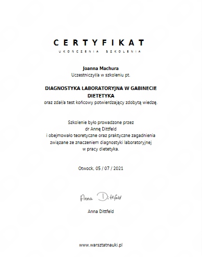 Jako dyplomowana dietetyczka pomogę Ci zmieniać nawyki żywieniowe, poprawić zdrowie oraz sprawić, że poczujesz się lepiej w swoim ciele. Poszerzając i aktualizując na bieżąco swoją wiedzę na różnych szkoleniach i kursach wiem, jak najlepiej i zgodnie z aktualną wiedzą naukową Ci pomóc. Pokazuję, że dieta nie musi być monotonna i niesmaczna, a zdrowe odżywianie i zdrowy styl życia mogą być łatwe i przyjemne.
