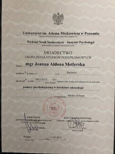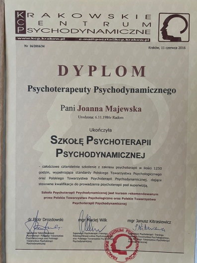 Jestem członkiem Polskiego Towarzystwa Seksuologicznego oraz Polskiego Towarzystwa Psychoterapii Psychodynamicznej, a moja praca podlega regularnej superwizji, co gwarantuje wysokie standardy mojej praktyki.