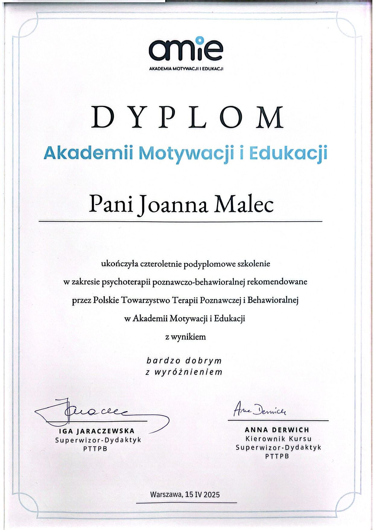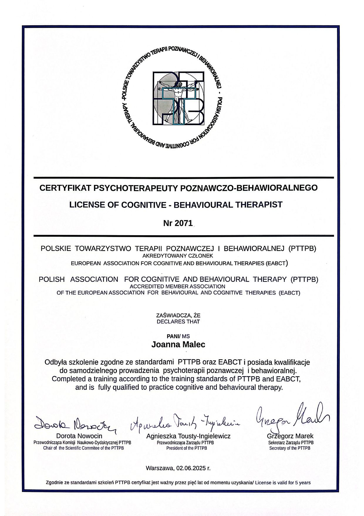 Jestem psycholożką, członkinią PTTPB oraz certyfikowaną psychoterapeutką Terapii Poznawczo-Behawioralnej (nr 2071). Ukończyłam 4-letnie akredytowane szkolenie z zakresu terapii poznawczo-behawioralnej (CBT).