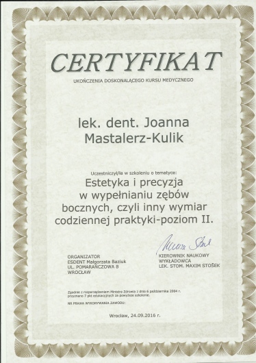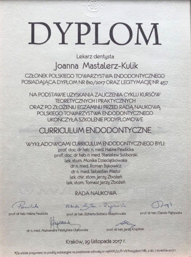Ukończyłam podyplomowy cykl szkoleń organizowany przez Polskie Towarzystwo Endodontyczne zakończony egzaminem i prezentacją przypadków przeleczonych przeze mnie zębów. Jestem dumną członkinią tego towarzystwa.