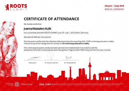 Regularnie uczestniczę w konferencjach i warsztatach takich jak Endomeeting czy Roots Summit w Berlinie, gdzie mogę poznać najnowsze możliwości i osiągnięcia w ratowaniu zębów przed usunięciem. Jestem aktywną uczestniczką międzynarodowych specjalistycznych grup dyskusyjnych.