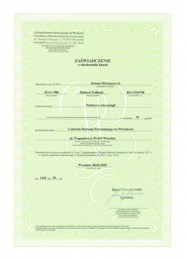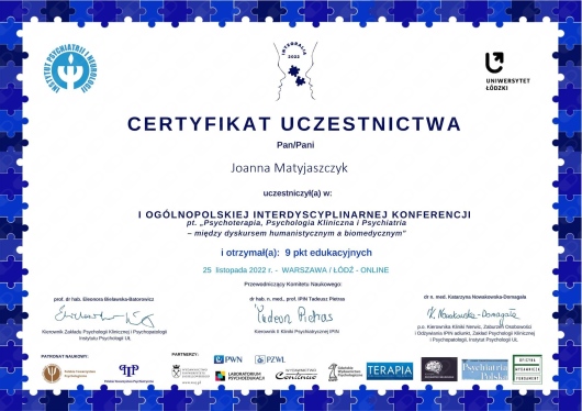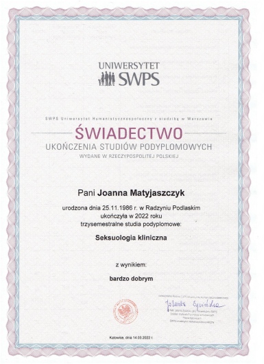 Jestem psycholożką i seksuolożką kliniczną. Pracuję z osobami dorosłymi i młodymi dorosłymi (od 18 r. ż.) doświadczającymi trudności w obszarze zdrowia psychicznego i seksualnego. Ukończyłam studia magisterskie na kierunku psychologia w Wyższej Szkole Humanitas w Sosnowcu. Studia seksuologiczne na kierunku Seksuologia Kliniczna odbyłam na Uniwersytecie SWPS w Katowicach. Jestem w trakcie czteroletniego, całościowego kursu psychoterapeutycznego organizowanego przez Oddział Leczenia Zaburzeń Osobowości Szpitala Klinicznego im. J. Babińskiego w Krakowie (aktualnie po drugim roku szkolenia). Kurs ten przygotowuje do uzyskania certyfikatu psychoterapeuty Polskiego Towarzystwa Psychiatrycznego i prowadzony jest w oparciu o podejście psychoanalityczne. Prowadzę psychoterapię indywidualną/ psychoterapię seksuologiczną osób doświadczających kryzysów emocjonalnych, trudności w relacjach z innymi, trudności związanych z adaptacją do zmieniającej się sytuacji życiowej, doświadczających kłopotów w sferze seksualnej. Pracuję pod superwizją w nurcie psychodynamicznym. Do kontaktu zapraszam również rodziców zainteresowanych wsparciem rozwoju psychoseksualnego swojego dziecka_i. Praca seksuologiczna, w moim odczuciu, wymaga często wyjścia poza ramy jednego paradygmatu. Pracując w tym obszarze korzystam z różnych podejść terapeutycznych. Prowadzona przeze mnie psychoterapia odbywa się z częstotliwością spotkań minimum raz do dwóch sesji tygodniowo. Swoją pracę poddaję stałej superwizji klinicznej u certyfikowanych superwizorów PTP,PTS i PTPP. Posiadam członkostwo Polskiego Towarzystwa Psychiatrycznego oraz Sekcji Naukowej Psychoterapii Polskiego Towarzystwa Psychiatrycznego.
