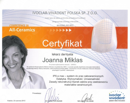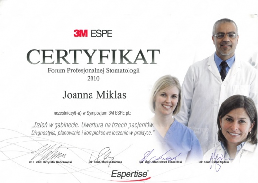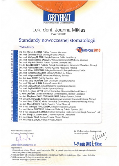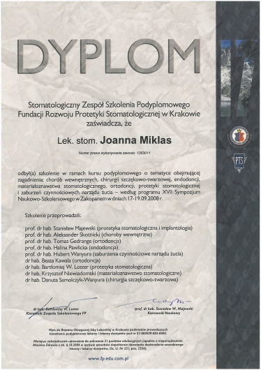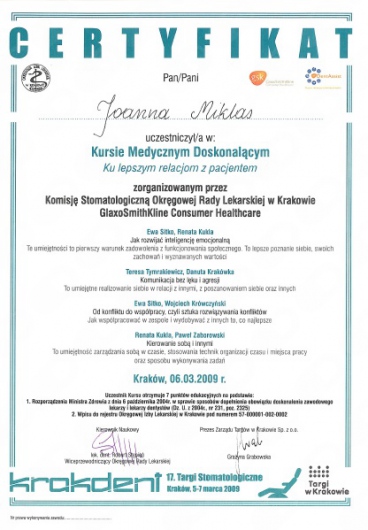 Swoją wiedzę poszerza na licznych szkoleniach i sympozjach,co dokumentują stosowne certyfikaty.