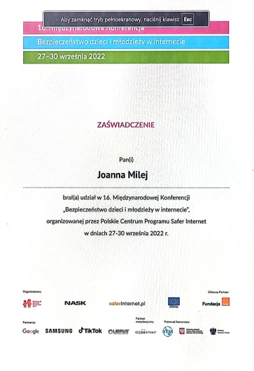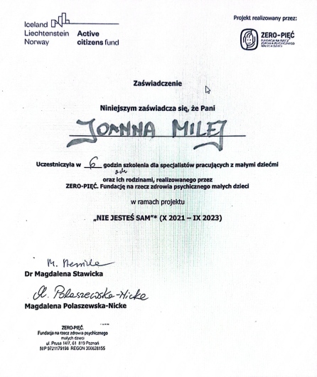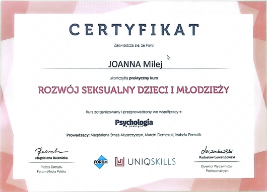 Brałam udział w szkoleniach z zakresu rozwoju seksualnego dzieci i młodzieży, zaburzeń emocjonalnych, a także w certyfikowanym kursie „Treningu umiejętności społecznych” (Studium Prawa Europejskiego). Uczestniczyłam również w szkoleniu Fundacji ZERO-PIĘĆ w ramach projektu „Nie jesteś sam”.