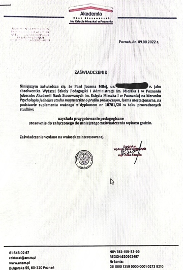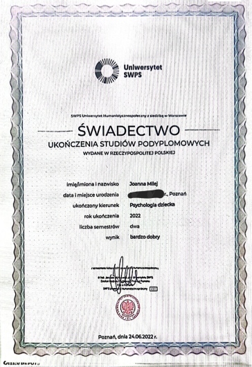 Jestem psychologiem z przygotowaniem pedagogicznym, ukończyłam jednolite studia magisterskie na kierunku psychologia (specjalność: psychologia wychowawcza) oraz studia podyplomowe z psychologii dziecka na Uniwersytecie SWPS.