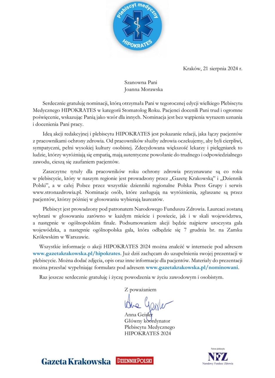 Jestem dyplomowanym lekarzem dentystą z wieloletnim doświadczeniem specjalizującym się w leczeniu zachowawczym, pedodoncji oraz endodoncji. Mówię biegle po angielsku. Posiadam wysokie umiejętności interpersonalne i komunikacyjne. Chętnie pracuję z najmłodszymi pacjentami. W 2024 roku moja praca została doceniona przez pacjentów w plebiscycie Hipokrates na najlepszego stomatologa w woj.małopolskim, gdzie zajęłam 2 miejsce. Jestem członkiem Polskiego Towarzystwa Stomatologii Dziecięcej oraz Polskiego Towarzystwa Stomatologicznego. Swoją wiedzę i umiejętności podnoszę nieustannie uczestnicząc w rozmaitych kursach, szkoleniach i konferencjach naukowych z zakresu stomatologii estetycznej, zachowawczej, dziecięcej i endodoncji. Jestem w trakcie studiów Medycyny Estetycznej dla Lekarzy.