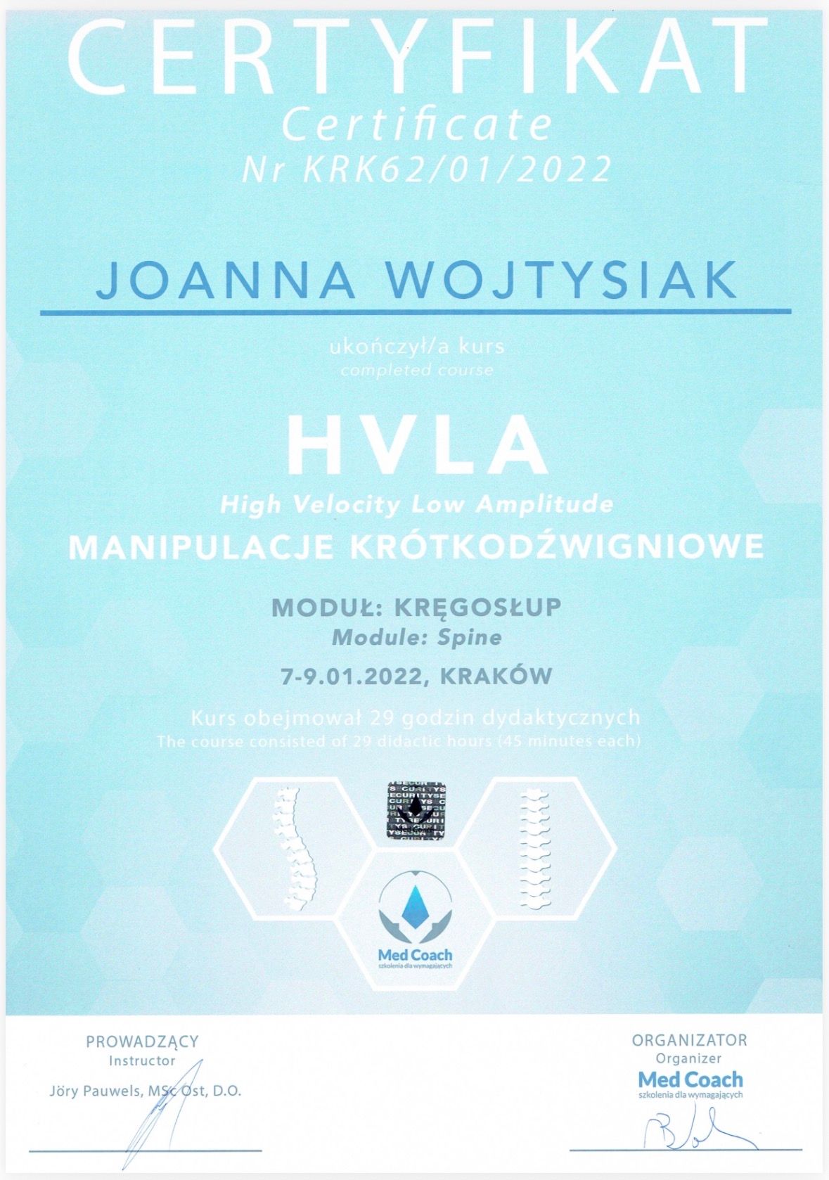 Fizjoterapia to moja praca, ale i pasja, dzięki czemu chętnie rozwijam swoją wiedzę i umiejętności. Ukończyłam liczne szkolenia i kursy m.in. PNF, pinoterapia, masaż tkanek głębokich, manipulacje krótkodźwigniowe HVLA, diagnostyka i leczenie stawów skroniowo- żuchwowych. Wykonuję również masaże klasyczne i relaksacyjne. Każdego pacjenta traktuję indywidualnie i z pełnym zaangażowaniem. Odpowiednio dostosowuję terapię do aktualnych potrzeb i stanu pacjenta. W trakcie wizyty zawsze udzielam wielu porad jak wesprzeć swoje ciało po wyjściu z gabinetu - w pracy, podczas treningu czy po prostu na co dzień.