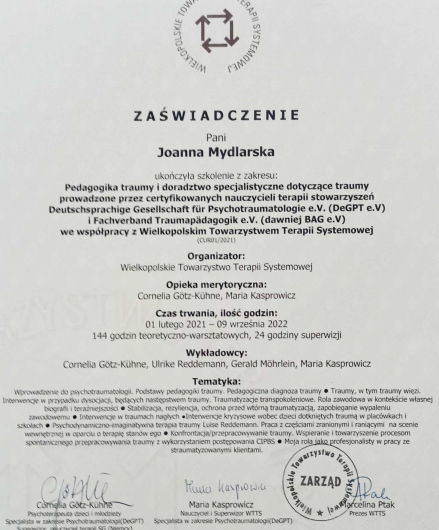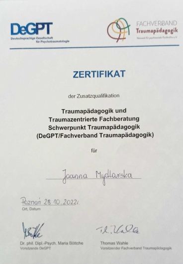 Studia psychologiczne magisterskie na UAM ukończyłam z wyróżnieniem, zaś doktorat na temat traumy psychologicznej broniłam na Uniwersytecie Medycznym w Poznaniu. Wciąż podnoszę swoje kompetencje naukowe (konferencje, artykuły naukowe) oraz profesjonalne - uczestniczę w profesjonalnych szkoleniach psychoterapeutycznych i korzystam z regularnych superwizji.