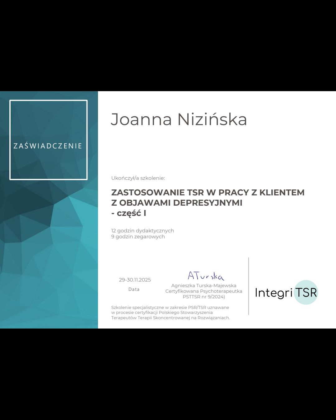 Mam na imię Joanna. Jestem psychologiem i terapeutą praktykującym w nurcie Terapii Skoncentrowanej na Rozwiązaniach (TSR). Ukończyłam studia magisterskie ze specjalnością psychologii klinicznej i psychoterapii, gdzie praktykowałam nurt CBT. Moją drugą specjalnością jest psychologia biznesu. Uważam, że każdy człowiek ma w sobie zasoby, które mogą pomóc w radzeniu sobie z wymaganiami i tworzeniem życia, jakie jest potrzebne.