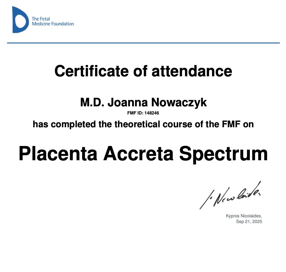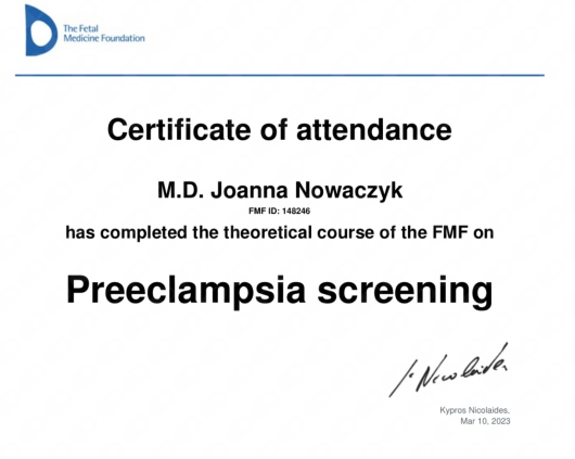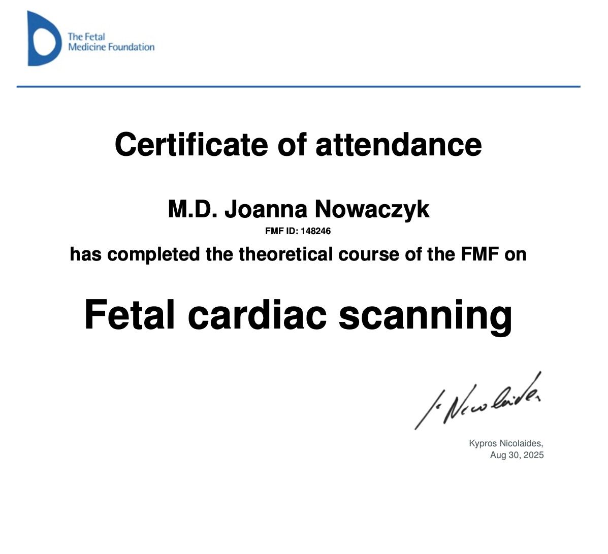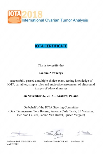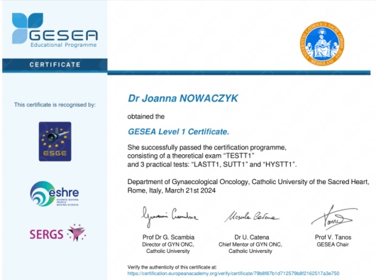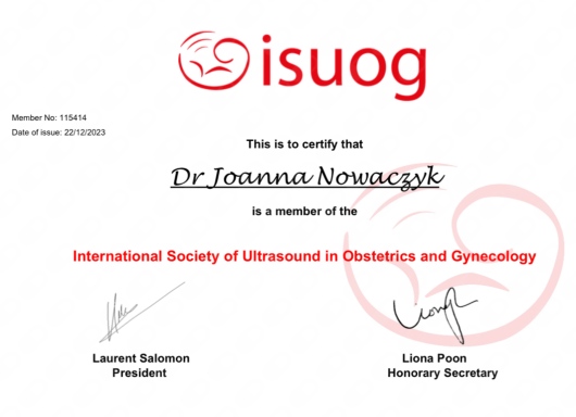 Jestem członkiem Polskiego Towarzystwa Ginekologów i Położników (PTGiP), oraz towarzystw międzynarodowych, posiadam m.in. certyfikat umiejętności PTGiP Wykonywania Badań Ultrasonograficznych w Położnictwie i Ginekologii, certyfikat FMF (Fetal Medicine Fundation) uprawniający do wykonywania badań prenatalnych. Ponadto doskonalę swoje umiejętności w zakresie operacji endoskopowych m. in. histersokopowych, uczestnicząc w międzynarodowym programie Gynaecological Endoscopic Surgical Education and Assessment (GESEA). Regularnie uczestniczę w szkoleniach, sympozjach i konferencjach.