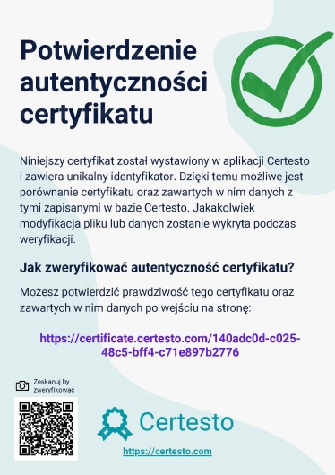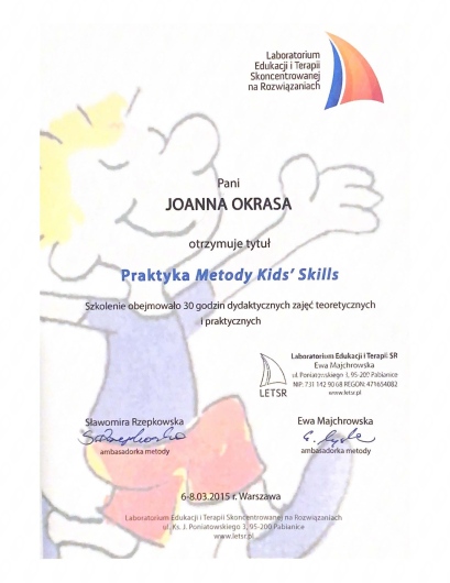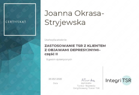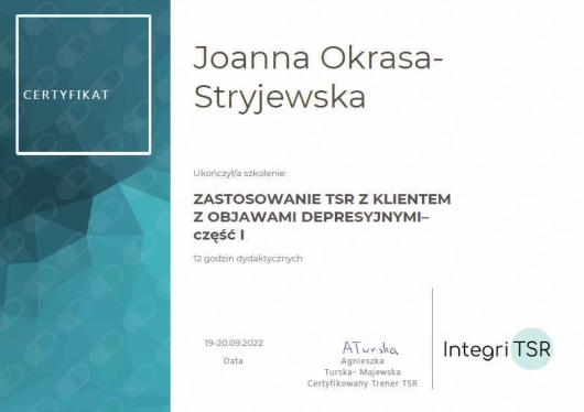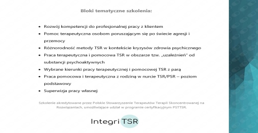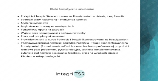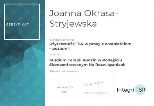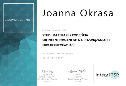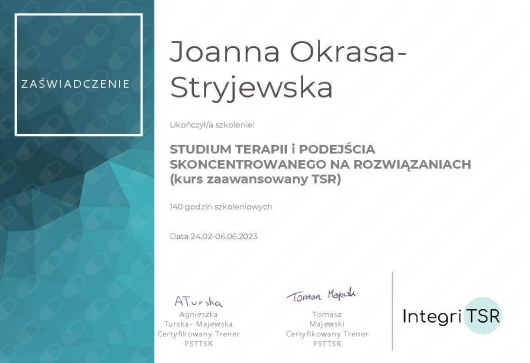 około 300 godzin szkoleń w nurcie terapii Skoncentrowanej na Rozwiązaniach, w tym Studium Terapii i Podejścia Skoncentrowanego na Rozwiązaniach Integri TSR,
