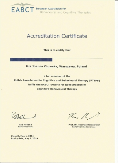 Jestem członkiem Polskiego Towarzystwa Terapii Poznawczej i Behawioralnej