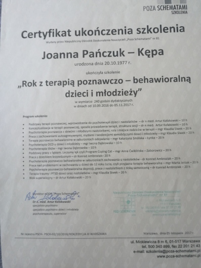 Stale podnoszę swoje kwalifikacje. Odbyłam wiele szkoleń z zakresu wsparcia psychologicznego i psychoterapii miedzy innymi: 2,5 letnie Studium „Psychoterapia Dziecka i Rodziny” w Krakowskim Instytucie Psychoterapii, roczny kurs w Polskim Instytucie Ericksonowskim. Ukończyłam pierwszy stopień kursu Terapii Skoncentrowanej na Rozwiązaniach oraz szkolenie z terapii EMDR. Uczestniczę w konferencjach naukowych. Moja praca podlega superrewizji u certyfikowanych superwizorów