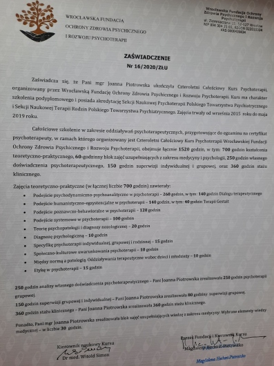 Stale podnoszę swoje kwalifikacje i rozwijam kompetencje uczestnicząc w specjalistycznych szkoleniach, warsztatach i konferencjach naukowych. Pracuję zgodnie z Kodeksem Etyczno – Zawodowym Psychologa. W trosce o najwyższą jakość oferowanej pracy regularnie korzystam z superwizji. Jestem członkinią Polskiego Towarzystwa Psychiatrycznego oraz Sekcji Naukowej Psychoterapii. Zapraszam na konsultację.