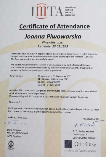 -Terapia Manualna Międzynarodowej koncepcji Maitland lv. 1,