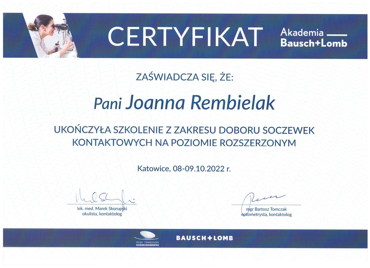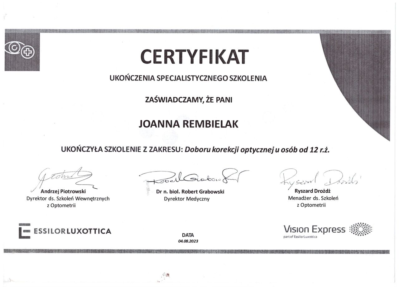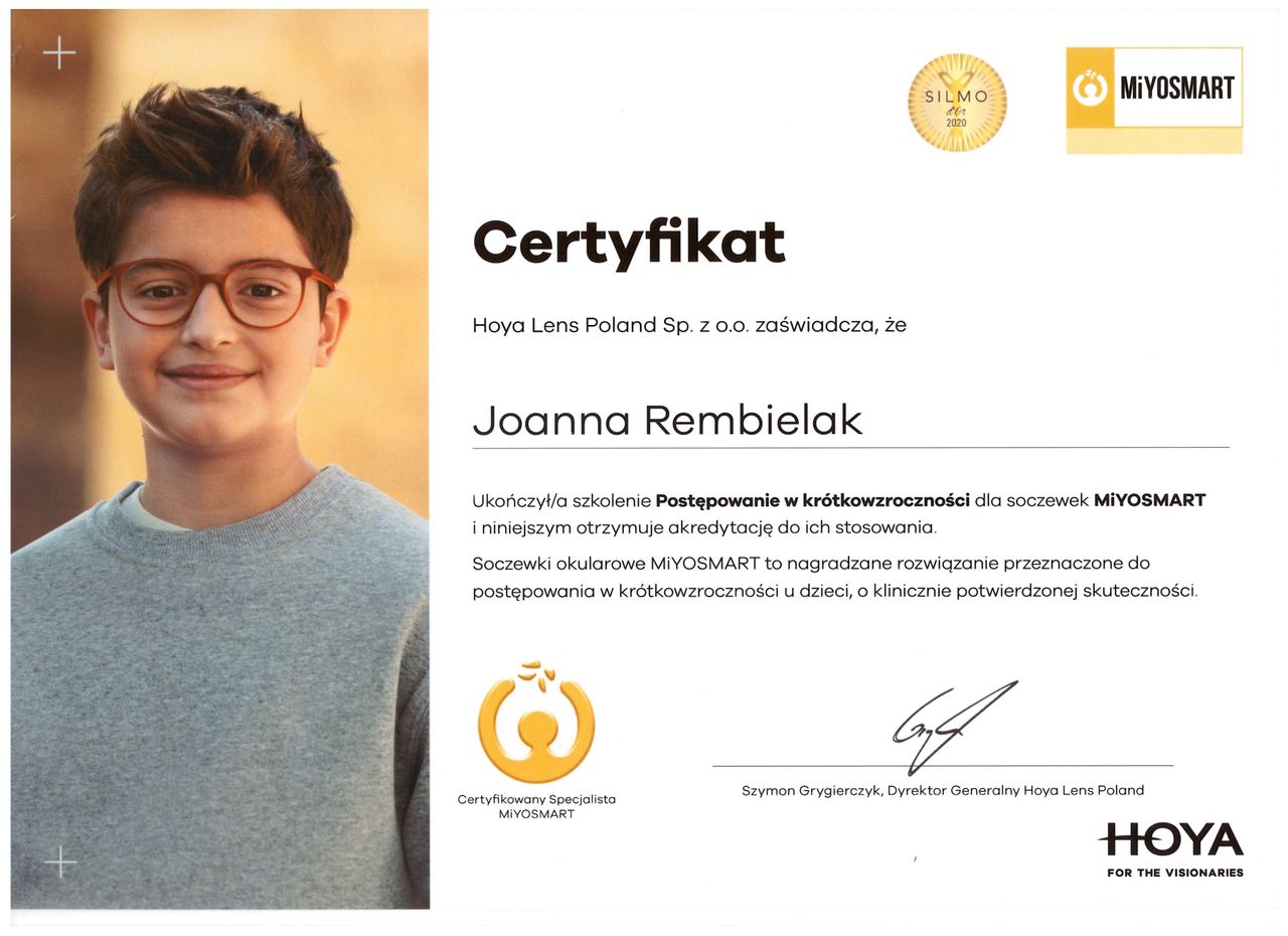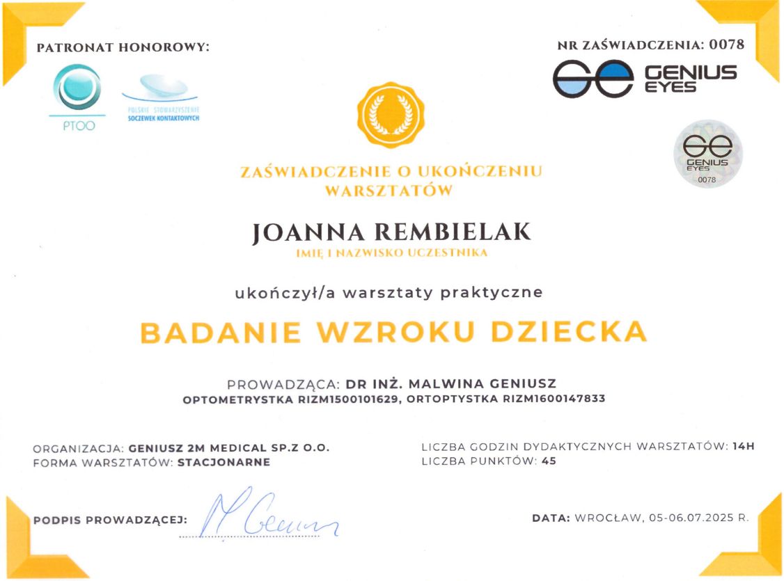 Jaki jest zakres porad oferowanych przez Joanna Rembielak?Joanna Rembielak to optometrysta. Na podstawie swojego doświadczenia i wykształcenia Joanna Rembielak oferuje usługi takie jak: Badanie wzroku + dobór okularów, aplikacja soczewek kontaktowych, badanie OCT, dobór soczewek MiyoSmart, Badanie oraz dobór soczewek kontaktowych, Konsultacja optometryczna, badania wzroku, dobór soczewek kontaktowych sztywnych, dobór soczewek kontaktowych miękkich, badania diagnostyczne.