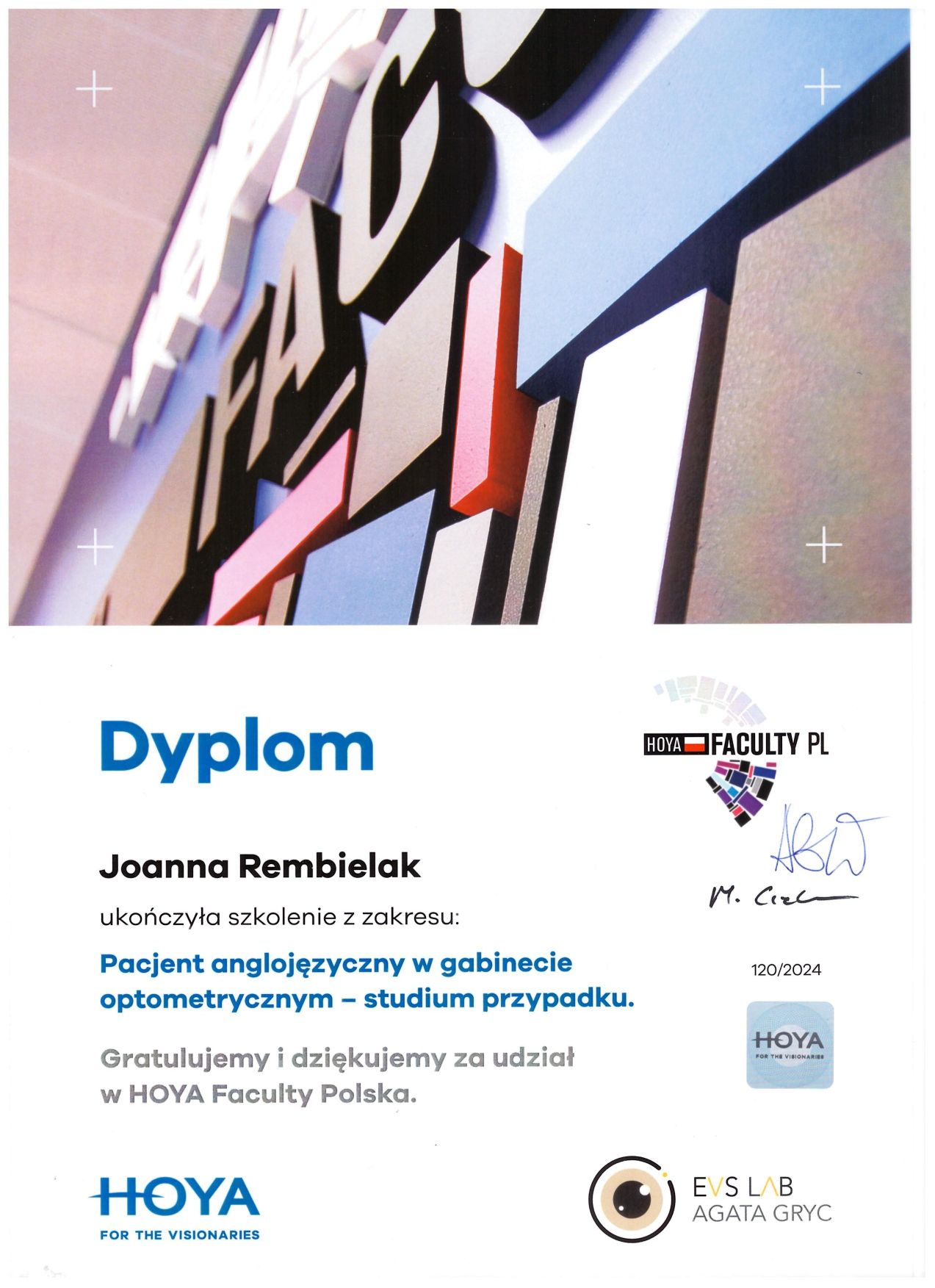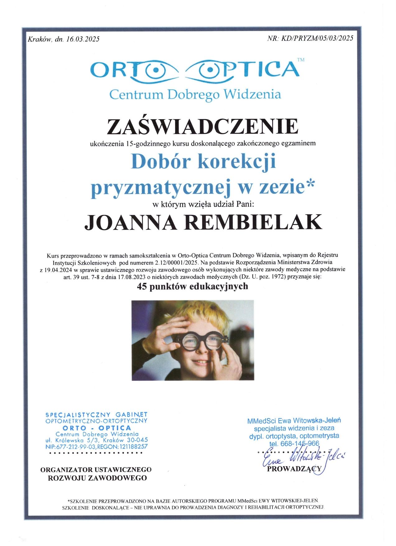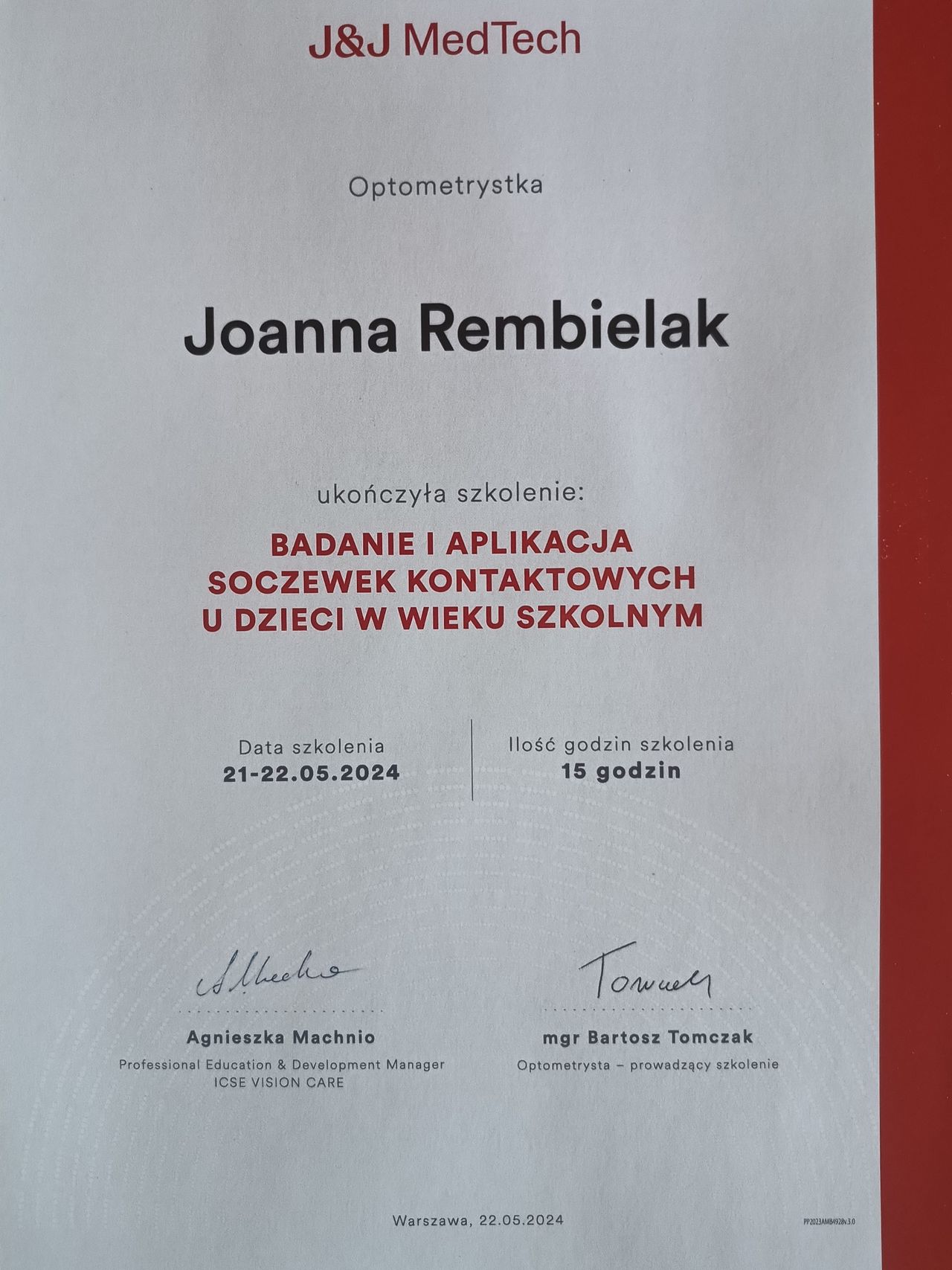 Stale poszerzam swoją wiedzę i umiejętności, regularnie uczestnicząc w szkoleniach, kursach i seminariach optometrycznych. Dzięki temu oferuję swoim pacjentom diagnostykę i rozwiązania zgodne z najnowszymi standardami oraz światowymi trendami w ochronie wzroku.