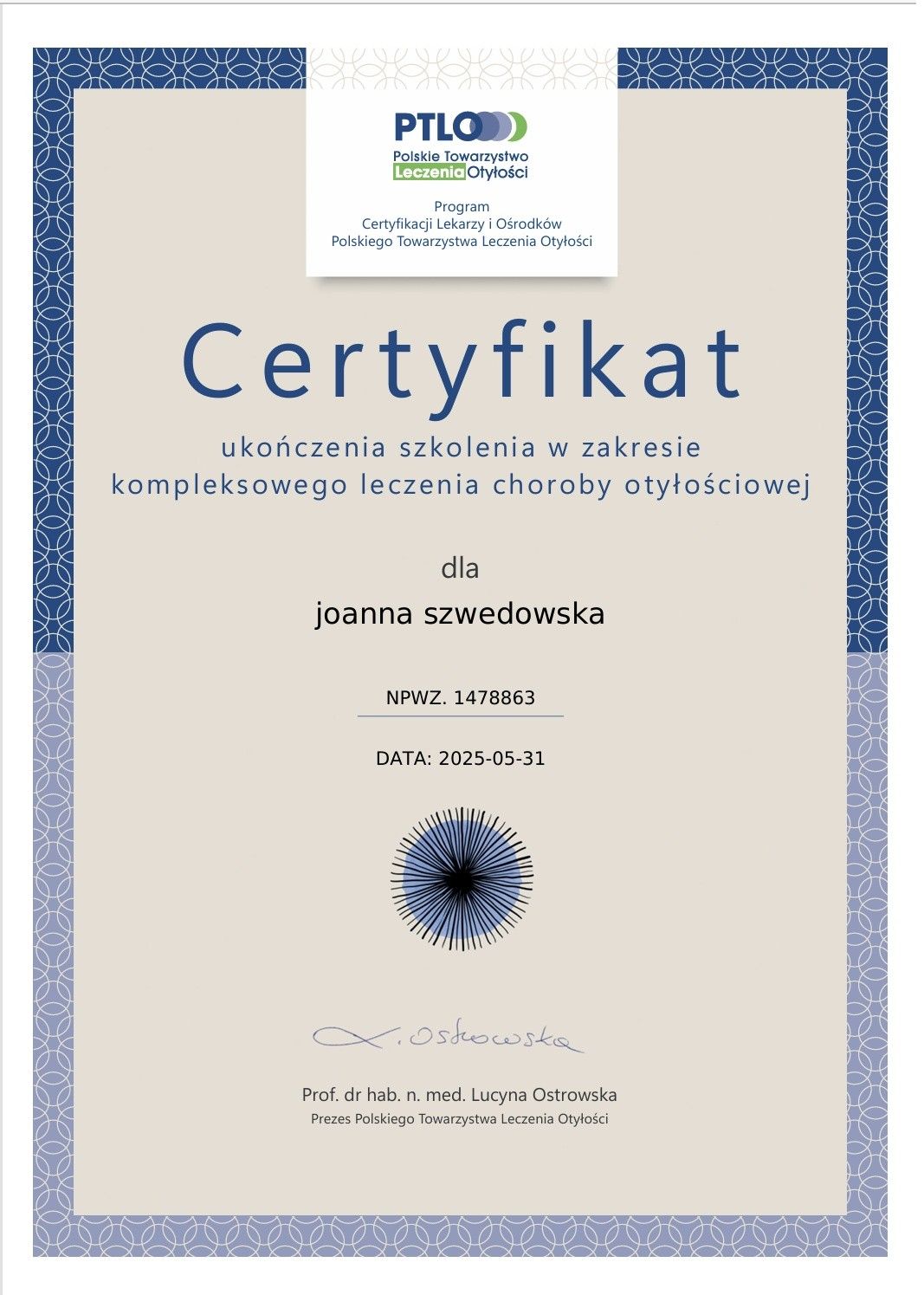 Obecnie zajmuje się również leczeniem choroby otyłościowej i jej powikłań, w ostatnich latach odbyłam liczne szkolenia i kursy w tym zakresie m. in. uzyskałam tytuł Certyfikowanego Lekarza Polskiego Towarzystwa Leczenia Otyłości oraz corocznie aktualizuję swoją wiedzę uczestnicząc w Kongresach Polskiego Towarzystwa Leczenia Otyłości.