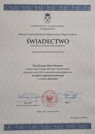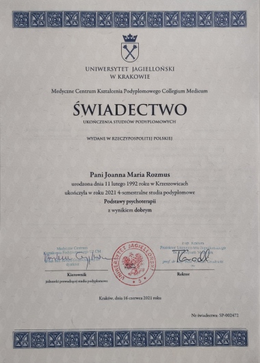 Jestem również psychoterapeutką. Ukończyłam czteroletnie studia podyplomowe Podstawy psychoterapii oraz Szczegółowe zagadnienia psychoterapii w Katedrze Psychoterapii UJ CM - kształcenie przygotowujące do uzyskania Certyfikatu Psychoterapeuty.