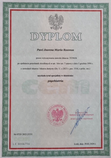 Jaki jest zakres porad oferowanych przez Joanna Rozmus?Joanna Rozmus to psychiatra, psychoterapeuta. Na podstawie swojego doświadczenia i wykształcenia Joanna Rozmus oferuje usługi takie jak: konsultacja psychiatryczna (pierwsza wizyta), konsultacja psychiatryczna (kolejna wizyta), konsultacja w języku angielskim, psychiatric consultation in English (first visit), Konsultacja psychiatryczna w języku angielskim - kolejna wizyta, psychiatric consultation in English (next visit), konsultacja psychiatryczna.