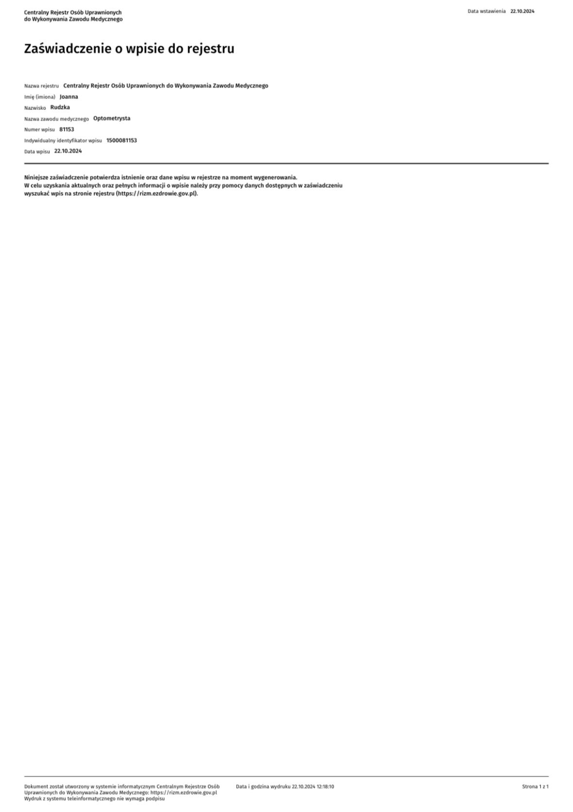 Pani Joanna Rudzka to optometrystka z prawdziwego powołania. Badanie wzroku przeprowadzone zostało niezwykle profesjonalnie, dokładnie i w bardzo przyjaznej atmosferze. Pani Joanna cierpliwie wyjaśnia każdy etap badania oraz proponuje najlepsze możliwe rozwiązania. Widać ogromną wiedzę i doświadczenie, a jednocześnie indywidualne podejście do pacjenta. Zdecydowanie polecam każdemu, kto szuka rzetelnej i kompetentnej specjalistki!