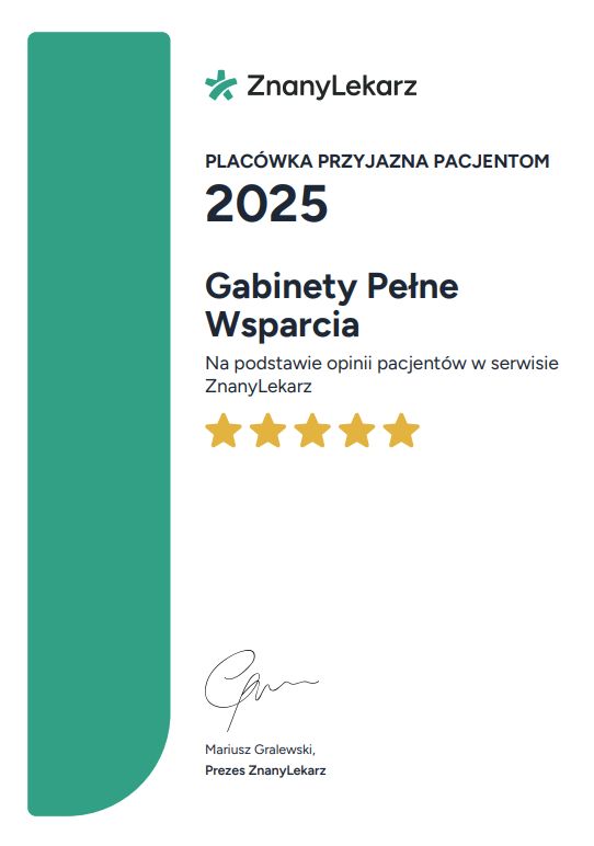 Administratorem danych osobowych jest ZnanyLekarz sp. z o.o. z siedzibą w Warszawie przy ul. Kolejowej 5/7. Informujemy, że po przekazaniu przez nas Twoich danych osobowych wybranemu przez Ciebie Profesjonaliście, staje się on również administratorem Twoich danych osobowych i przetwarza je w celach związanych ze świadczeniem usług medycznych lub innych podobnych.