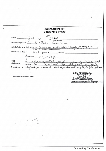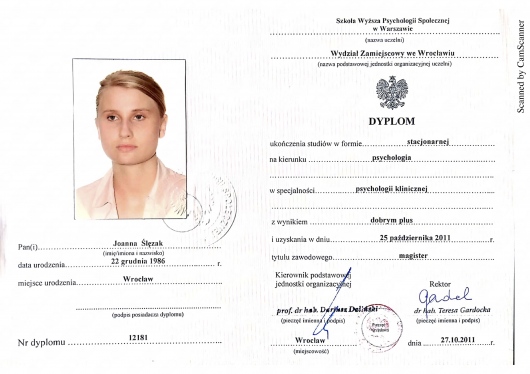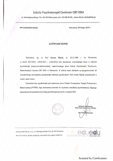 Aby poszerzyć kompetencje psychologiczne o psychoterapeutyczne zdecydowałam się na rozpoczęcie 4 letniego szkolenia terapeutycznego w terapii poznawczo-behawioralnej. Dzięki szkoleniu ugruntowałam swoją wiedzę kliniczną oraz poszerzyłam umiejętności diagnostyczne, zdobyłam również szeroki wachlarz technik terapeutycznych dzięki którym mogę skuteczniej i sprawniej prowadzić procesy terapeutyczne. Otrzymałam również wiedzę jak we właściwy sposób budować empatyczną, opartą na zaufaniu relację terapeuty z pacjentem.