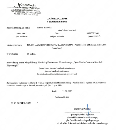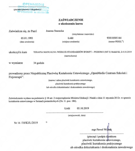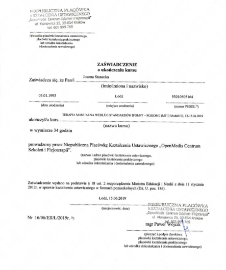 mięśniową, techniki wisceralne, terapię manualną, elementy treningu medycznego. Regularnie