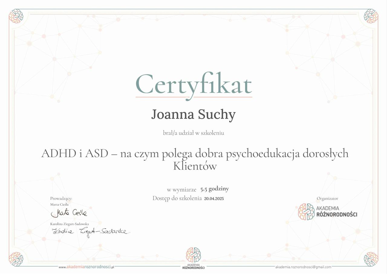 Zdecydowanie polecam. To była moja druga wizyta u Pani Asi, ponownie poczułam się wysłuchana i zrozumiana, całość wizyty przebiegła w bardzo komfortowej atmosferze. Porady, które otrzymałam były rzeczowe, a Pani Asia cierpliwie odpowiadała na moje wszystkie pytania. Cała wizyta była naprawdę pozytywna i mam nadzieję, że pomoże mi z uporaniem się z moim problemem.