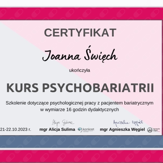 Jestem psycholożką, psycholożką bariatryczną oraz fizjoterapeutką.