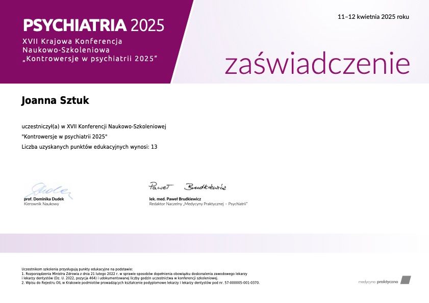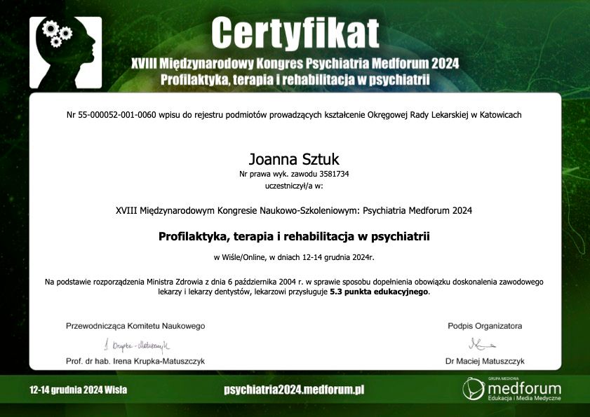 Jestem zadowolony ze wsparcia psychiatry Joanny Sztuk.