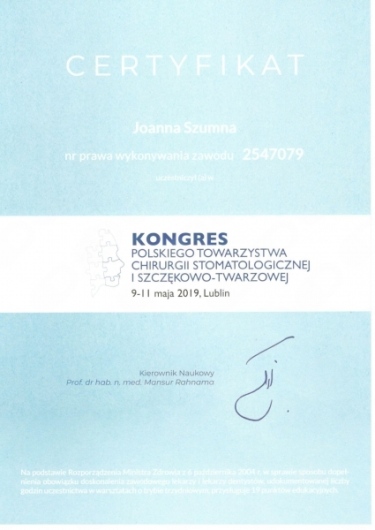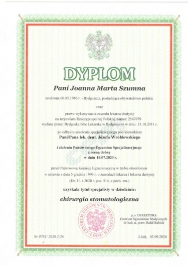 Jaki jest zakres porad oferowanych przez Joanna Szumna?Joanna Szumna to chirurg stomatologiczny. Na podstawie swojego doświadczenia i wykształcenia Joanna Szumna oferuje usługi takie jak: Konsultacja chirurgiczna, usuwanie zębów zatrzymanych, operacyjne usunięcie zęba całkowicie zatrzymanego, usunięcie zęba ósmego, konsultacja chirurga stomatologicznego, usunięcie zęba stałego.