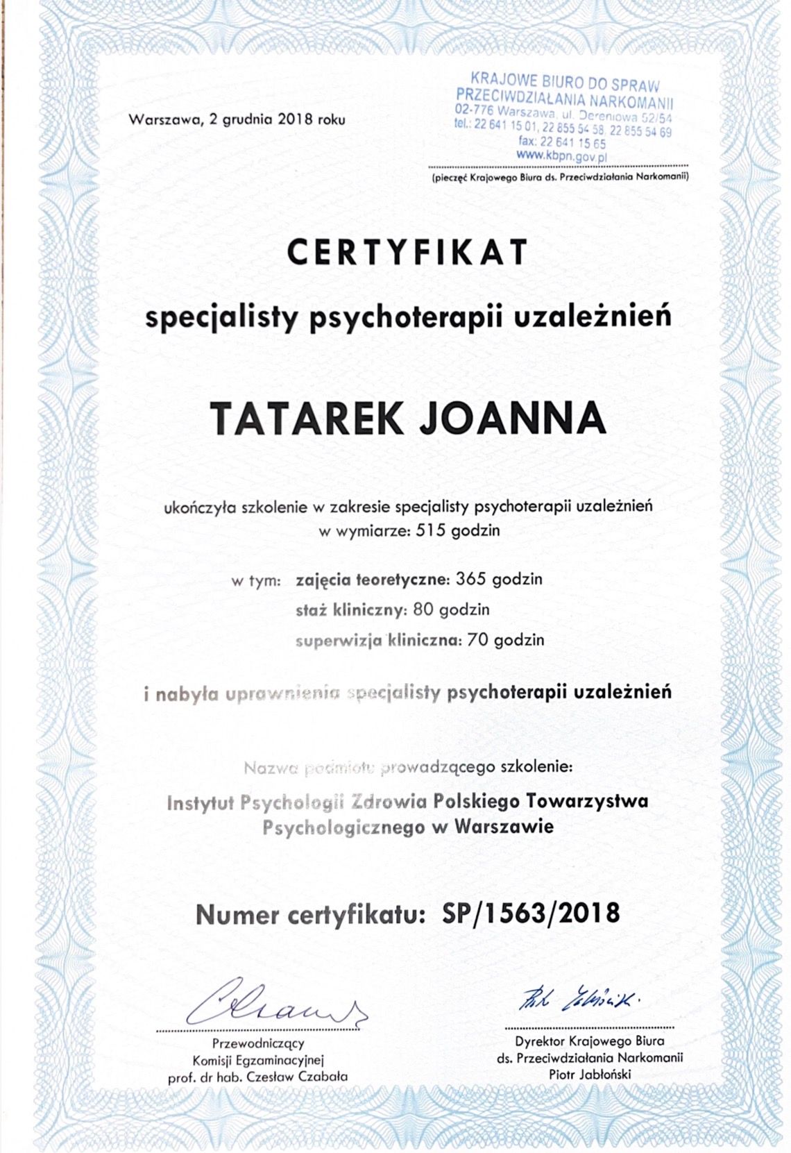 Jestem psychologiem, certyfikowanym Psychoterapeutą Uzależnień (nr SP/1563/2018) oraz dyplomowaną terapeutką środowiskową dzieci i młodzieży. Aktualnie szkolę się w Krakowskiej Szkole Psychoterapii Psychoanalitycznej.